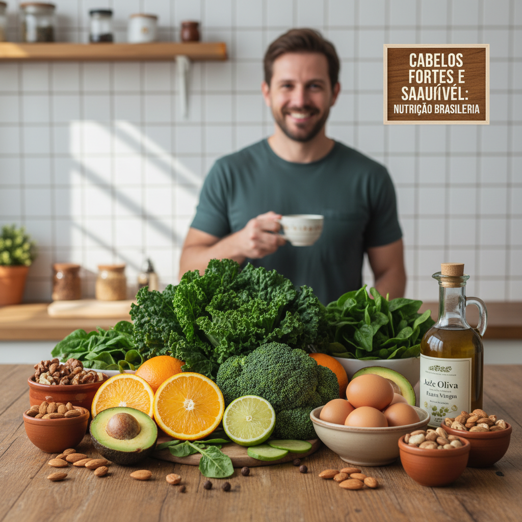 Alimentos como ovos, nozes, sementes, peixes gordurosos (salmão), carnes magras, legumes, frutas cítricas, folhas verdes escuras e batata-doce são ricos em vitaminas e minerais essenciais para a saúde capilar masculina, como biotina, zinco, ferro e vitaminas C e do complexo B.