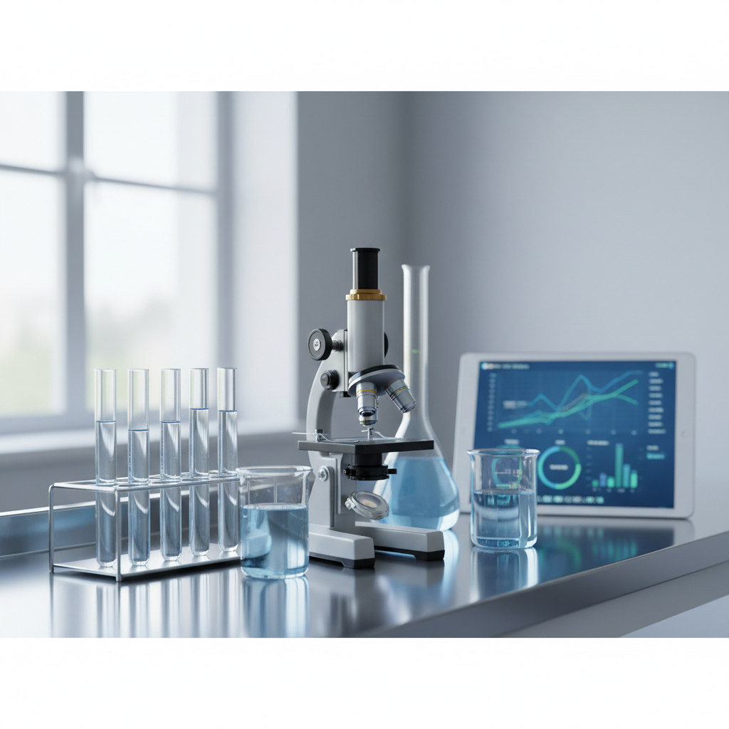 Uma mesa de laboratório limpa com tubos de ensaio, beakers e um microscópio, simbolizando a pesquisa científica por trás dos suplementos. Há um tablet mostrando gráficos de dados em segundo plano, com um foco em clareza e precisão. Estilo foto realista, alta qualidade