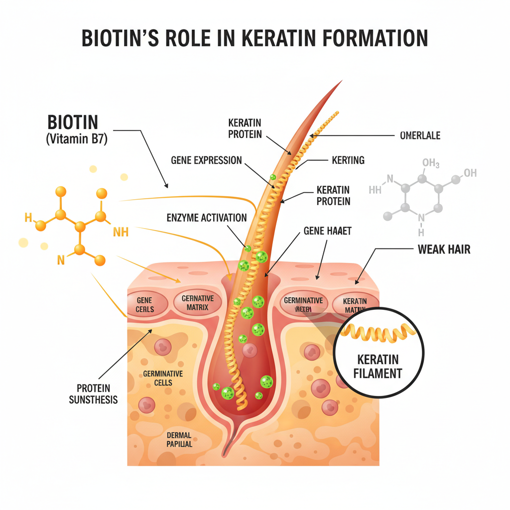 - Mecanismo de Ação Detalhado: Como a Biotina atua na produção de queratina.